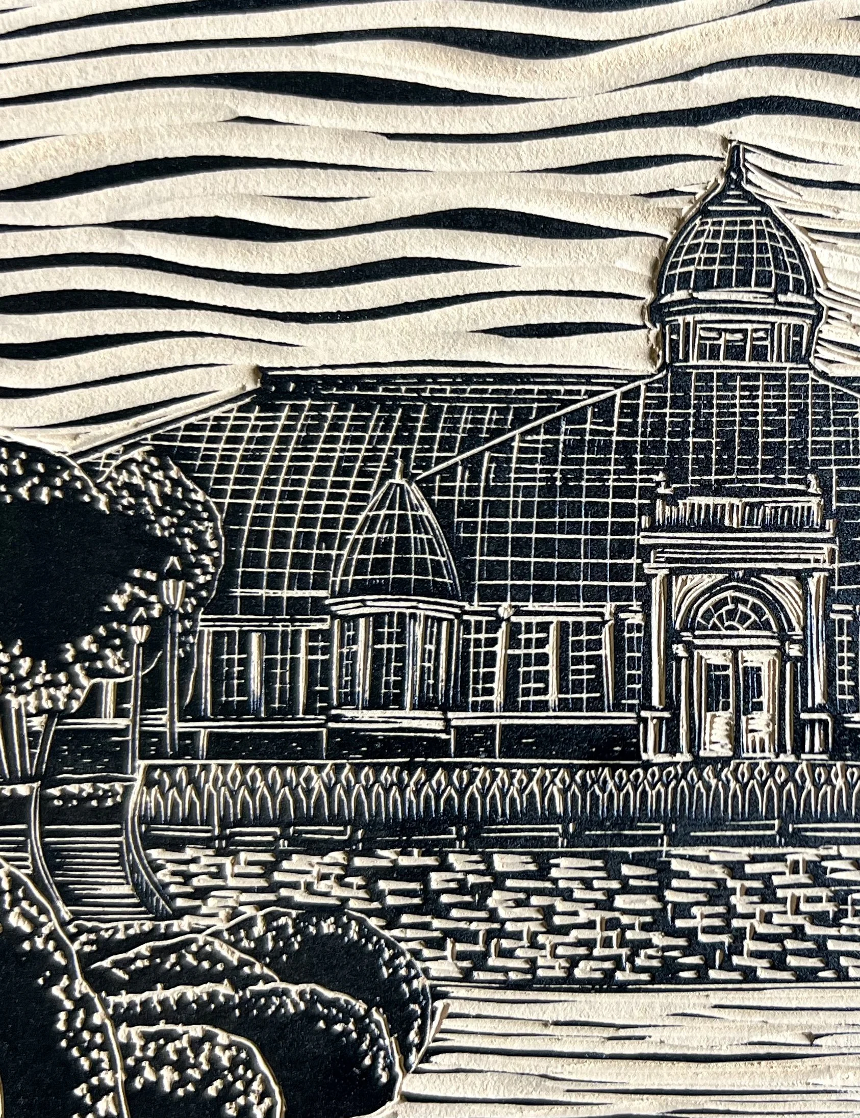 Carved linoleum ink print of the Franklin Park Conservatory in Columbus, OH